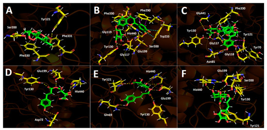 Predicted binding mode and predicted intermolecular interactions between selected compounds in D. winteri fruit extract and the residues of Torpedo Californica acetylcholinesterase (TcAChE) catalytic site. Yellow dotted lines indicate hydrogen bond interactions, cyan dotted lines represent π-π interactions, magenta dotted lines represent T-shaped interactions, and grey dotted lines represent hydrophobic interactions. (A) Artemisinin into the catalytic site; (B) eriodictyol 7-O-hexoside into the catalytic site; (C) 2″′-O-(3″′,4″′-dimethoxybenzoyl) vitexin into the catalytic site; (D) 5-O-p-coumaroyl quinic acid into the catalytic site; (E) 3-O-caffeoylquinic acid into the catalytic site; (F) hydroxy caffeoylquinic acid into the catalytic site.