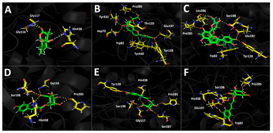 5-O-p-Coumaroyl quinic acid showed five hydrogen bond interactions, and no π-π interactions were observed in docking results. The hydrogen bond interactions were performed by the hydroxyl groups and the carboxylate function at the sugar core. Indeed, through the two oxygen atoms of carboxylates, three hydrogen bond interactions were observed with residues Gly116, Ser198, and His483. The remaining interactions were performed with the amino acid Pro285 and the two hydroxyls of the sugar motif (Figure 5D). 3-O-Caffeoylquinic acid and hydroxy caffeoylquinic acid, as with eriodictyol 7-O-hexoside and 2”-O-(3”’,4”’-dimethoxybenzoyl) vitexin, showed similar binding energy values (see Table 4). Both quinic acid-related derivatives possess similar structures and settle in a similar manner into the butyrylcholinesterase catalytic site, and thereby shared their hydrogen bond interactions with many residues. 3-O-caffeoylquinic acid performed hydrogen bond interactions with Gly117, Tyr128, Ser198, Pro285, Ser287, and His438, while hydroxy caffeoylquinic acid performed the same type of interactions with the residues of Trp82, Glu197, Ser198, Pro285, and His438 (Figure 5E,F).