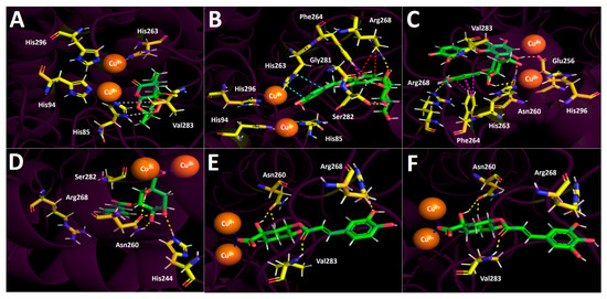 Predicted mode of binding and predicted inter-molecular interactions of selected compounds in D. winteri fruit extract and the residues of human Agaricus bisporus mushroom tyrosinase catalytic site. Yellow dotted lines indicate hydrogen bond interactions, cyan dotted lines represent π-π interactions, magenta dotted lines represent π-π interactions, red dotted lines represent π-cation interactions, blue dotted lines represent salt bridge interactions, and grey dotted lines represent hydrophobic interactions. (A) Artemisinin into the catalytic site; (B) eriodictyol 7-O-hexoside into the catalytic site; (C) 2″-O-(3″′,4″′-dimethoxybenzoyl) vitexin into the catalytic site; (D) 5-O-p-coumaroyl quinic acid into the catalytic site; (E) 3-O-caffeoylquinic acid into the catalytic site; (F) hydroxy caffeoylquinic acid into the catalytic site.