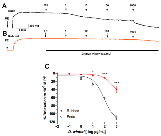 Original record of vascular relaxation using D. winteri extract in intact rat aortic rings (Endo) (A) or denuded endothelium (Rubbed) (B). Concentration-response curve for D. winteri fruit ethanolic extract in intact aortic rings (endo) or denuded endothelium (rubbed) (C). The rat aorta was pre-contracted with 10−6 M PE for 10 min, then every 7 min, rising concentrations of ethanolic extract (0.1 to 1000 µg/mL) were added to the bath. Data are the mean ± SEM of three to five independent experiments. * p < 0.05; *** p < 0.001 vs. endo.
