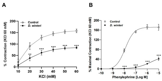 D. winteri fruit decreases the vascular contractile response in intact aorta. Tissue was contracted with accumulative concentrations of KCl (10–60 mM) or phenylephrine (from −10 to −5 [log M]). Aortic rings were pre-incubated with D. winteri extract (100 μg/mL) for 20 min, then accumulative concentrations of KCl (A) or phenylephrine (B) were added. Data are the average ± SEM of four to five independent experiments. ** p < 0.01, *** p < 0.001 vs. control.