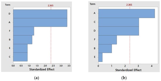 Pareto diagram of the independent variables’ effect studied on (a) antibacterial capacity against S. aureus strain and (b) antioxidant activity of FPs.