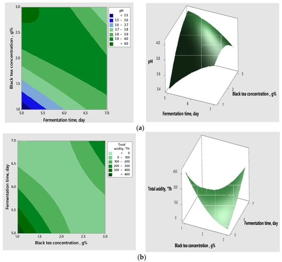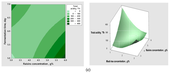 The ANOVA results from Table 4 showed the significant contributions for the concentration of tea (p = 0.004), the concentration of raisins, and for the fermentation time (p = 0.019). Furthermore, this statistical model can be validated based on in the non-significant lack of fit (p = 0.923) [30].