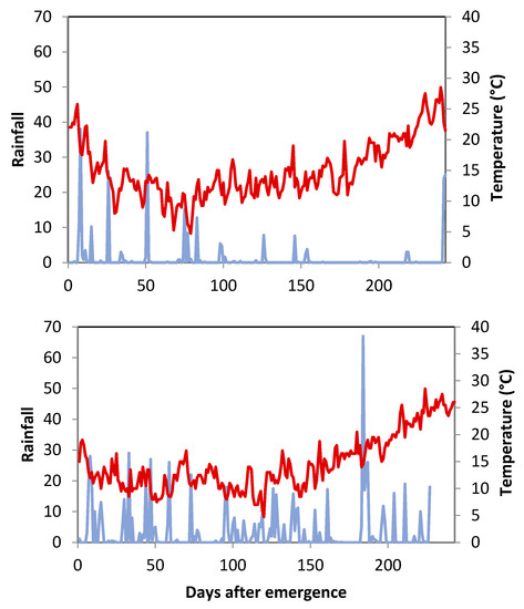 Meteorological data such as maximum and minimum temperatures, rainfall, solar radiation, and air relative humidity were monitored by a meteorological station approximately 300 m away from the field. Data were used to calculate the minimum and maximum temperatures and the number of days with temperatures higher than 25 °C and 30 °C.