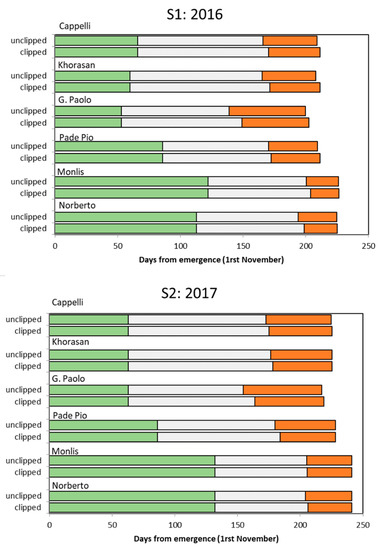 Effect of season, cultivar, and clipping on the length of the vegetative growth (from emergence until clipping, in green and from clipping until flowering, in white) and on the grain filling period (from flowering until physiological maturity, in orange).