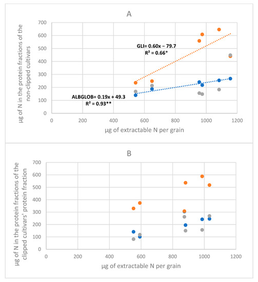 Relationships between the variation in the grain extractable nitrogen (x) and the N content of the protein fractions (y): albumin and globulins (ALBGLOB) (blue dots), glutenins (GLU) (gray dots), and gliadins (GLI) (orange dots), under non-clipped (A) and clipped (B) conditions. Points are cultivar means across seasons. ** p ≤ 0.01, * p ≤ 0.05. Non-significant relationships are not reported.