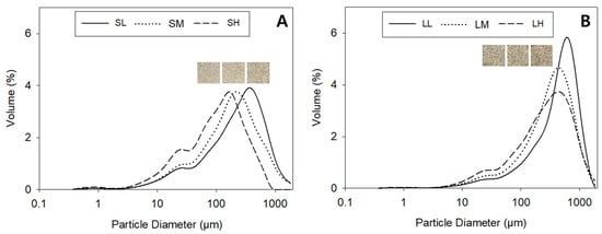 Particle size distribution in purple-colored WWF samples prepared at different milling conditions: (A) group S, SL, SM, and SH, 0.5 mm sieve opening and rotor speeds of 6000, 10,000, and 14,000 rpm, respectively; (B) group L, LL, LM, and LH, 1.0 mm sieve opening and rotor speeds of 6000, 10,000, and 14,000 rpm, respectively.