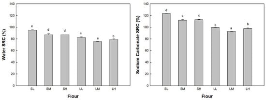 SRC of the flour samples: group S, SL, SM, and SH, 0.5 mm sieve opening and rotor speeds of 6000, 10,000, and 14,000 rpm, respectively; group L, LL, LM, and LH, 1.0 mm sieve opening and rotor speeds of 6000, 10,000, and 14,000 rpm, respectively. The same letters above the bars are not significantly different at p = 0.05, according to Tukey’s HSD test.