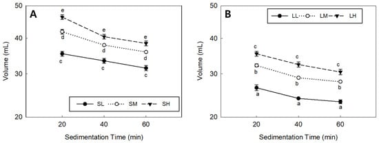 SDS sedimentation volume in the purple-colored WWF samples: (A) group S, SL, SM, and SH, 0.5 mm sieve opening and rotor speeds of 6000, 10,000, and 14,000 rpm, respectively; (B) group L, LL, LM, and LH, 1.0 mm sieve opening and rotor speeds of 6000, 10,000, and 14,000 rpm, respectively. The same letters above or below the symbols in line plots at the same sedimentation time are not significantly different at p = 0.05, according to Tukey’s HSD test.