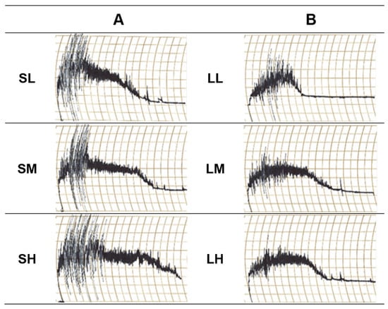 Mixograms of purple-colored WWF samples: (A) group S, SL, SM, and SH, 0.5 mm sieve opening and rotor speeds of 6000, 10,000, and 14,000 rpm, respectively; (B) group L, LL, LM, and LH, 1.0 mm sieve opening and rotor speeds of 6000, 10,000, and 14,000 rpm, respectively.