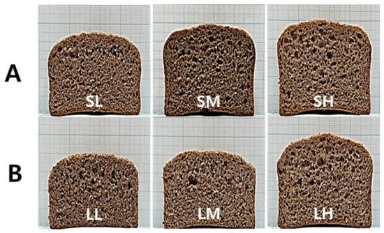 Table 6 reveals that the addition of xylanase and amylase did not significantly affect the height and volume of WWB. Only SH WWB showed a slight increase in height and volume. With the addition of 150 ppm xylanase, SH WWB increased in height from 41.6 mm to 42.2 mm and in volume from 320.4 mL to 348.0 mL. LH WWB decreased in height from 41.4 mm to 38.6 mm and in volume from 323.9 mL to 312.9 mL. Several studies have shown an increased loaf volume in WWB with the addition of xylanase [42,43,44,45,46], although our results did not show a significant effect. Xylanase is known to improve gluten hydration, network formation, and dough expansion during fermentation by reducing flour water absorption [43,44,46]. The particle sizes of whole wheat flour (158 and 261 μm) with the addition of 60 and 100 ppm xylanase content reduced the undesirable effects of fibers in the dough, leading to improved bread making [45]. An increased loaf volume could result from water transfer from pentoses to gluten, leading to the restructuring of the gluten network and increased dough expansion [46], less interference with gluten network formation by hydrolyzed low-molecular-weight hemicellulose [47], and the conversion of water-unextractable arabinoxylans to water-extractable arabinoxylans, leading to improved gas retention capacity [42]. However, the level and type of xylanase used also affect the WWB volume due to varied activities and action patterns, emphasizing the importance of optimizing the enzyme usage level [44]. On the other hand, with the addition of 15 ppm amylase, SH WWB increased in height from 41.6 mm to 41.7 mm and in volume from 320.4 mL to 348.9 mL. LH WWB decreased in height from 41.4 mm to 39.9 mm and volume from 323.9 mL to 328.1 mL. Armero and Collar [48], Bae et al. [49], and Boz et al. [16] reported an increased loaf volume in WWB after adding α-amylase. Amylase easily hydrolyzes damaged starch, generating free sugars that aid yeast fermentation. Since SH WWF contained more damaged starch than LH WWF, it was expected to result in a larger bread volume for SH WWB compared to LH WWB. In our study, the addition of xylanase and amylase demonstrated similar increases in bread volume and height, suggesting a comparable enhancement in WWB quality.