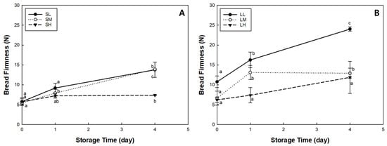Changes in bread firmness during storage at 4 °C: (A) group S, SL, SM, and SH, 0.5 mm sieve opening and rotor speeds of 6000, 10,000, and 14,000 rpm, respectively; (B) group L, LL, LM, and LH, 1.0 mm sieve opening and rotor speeds of 6000, 10,000, and 14,000 rpm, respectively. The same letters near the symbols in the line plots are not significantly different at p = 0.05, according to Tukey’s HSD test.