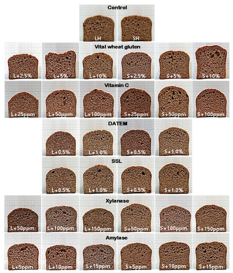 The SH and LH WWF WWBs exhibited favorable quality characteristics, which were then used to investigate the effects of dough improvers on bread quality. Cross-sectional photographs and the quality characteristics of these WWBs with the addition of dough improvers are shown in Figure 7 and Table 4, Table 5 and Table 6. The influence of vital wheat gluten on bread appearance was evident in the cross-sectional photographs, whereas the effect of amylase was negligible.