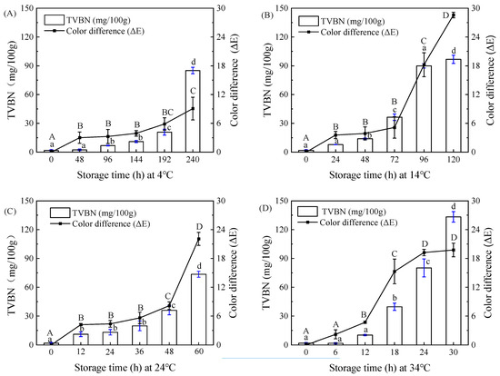 3.3.2. Dynamics Analysis of TVBN and Indicator Labels Color in Pork Mince