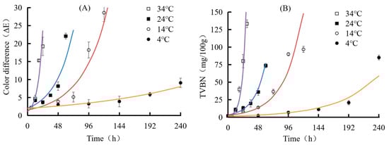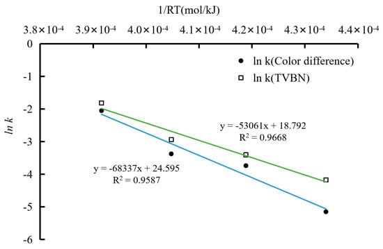 | Storage Temperature (°C) | Change Trend of TVBN | R2 | The Rate Constants | ln k |