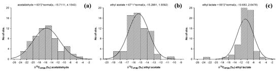 Table 2 shows the statistical analysis realized in the experimental data obtained from the Tequila 100% agave silver class samples. It can be observed that the data for acetaldehyde (Figure 1a), ethyl acetate (Figure 1b), methanol (Figure 2a), and ethanol (Figure 2b), have a behavior that fits to a normal distribution, with values of a coefficient of variation less than 10% with a mean value at −15.7‰, −15.3‰, −24.8‰ and −12.9‰, respectively. Among them, the values obtained for ethanol and methanol stand out because their values can be associated with the agave plant used in beverage production, so these parameters can be considered to be broadly representative of the universe of samples studied.