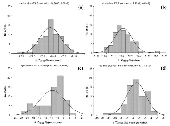 On the other hand, δ13CVPDB values for n-propanol (Figure 2c), isoamyl alcohol (Figure 2d), and ethyl lactate (Figure 1c) tend to have a normal distribution with a value that has a positive trend, with centered means at −11.7‰, −6.5‰ and −10.7‰, respectively. Consequently, these compounds have higher values in their variation coefficients (>20%), and this effect its related to Tequila 100% agave production processes. It is proposed that these variations could be due to the fermentation and distillation stages, due to the fact that each company possesses yeast strains and specific operational parameters to grant unique organoleptic properties to their products [32,33,34,35,36,37]. These differences can also be observed when comparing the values of Tequila against alcoholic beverages produced from other agave species. Unlike the production of Tequila, the production processes of Mezcal, Sotol, Raicilla, and Bacanora follow artisanal practices, highlighting the stages of cooking, fermentation, and distillation [33,38,39,40].