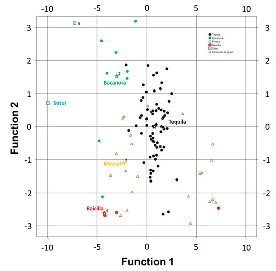 The graphic representation of the classification of the analyzed samples is presented in Figure 3. It is observed that the discriminant functions obtained are not capable of classifying the analyzed beverages since in the case of Bacanora and Mezcal the analyzed samples can be classified as 100% Tequila agave, without being. Therefore, the use of new chemometric strategies becomes essential to determine the authenticity of the beverage.
