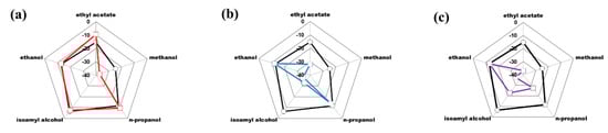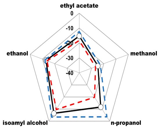 Based on the previous chemometric analysis, it was defined that the molecules of ethyl acetate, methanol, n-propanol, isoamyl alcohol and ethanol correspond to the congeners that have the greatest weight to classify each beverage. Considering the above, the radar plot presented in Figure 4 was constructed, representing the isotopic fingerprint of Tequila 100% agave silver class, defined from the average values of δ13CVPDB of the molecules of ethyl acetate, methanol, n-propanol, isoamyl alcohol, and ethanol. The dashed lines represent the acceptance range of two standard deviations.