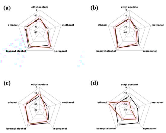 Isotopic fingerprint (radar plot) of δ13CVPDB (‰) mean values for Tequila 100% agave silver class (black line) versus (a) Mezcal, (b) Bacanora, (c) Raicilla and (d) Sotol (red line).