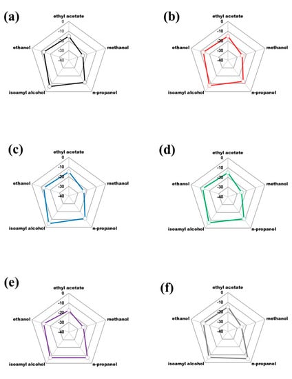 Isotopic fingerprint (radar plot) of δ13CVPDB (‰) mean values for a Tequila 100% agave silver class according to the geographic region: (a) Altos sur, (b) Centro, (c) Cienega, (d) Valles, (e) Guanajuato and (f) Michoacán.