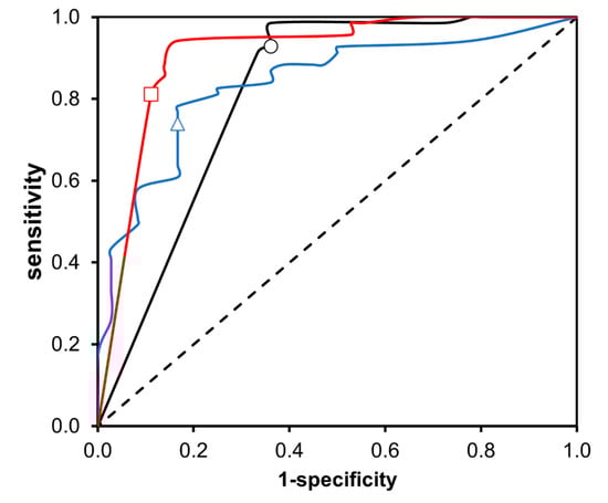 ROC curves from the diagnostic tests conducted to determine authenticity of Tequila 100% agave silver class sample. Threshold Criteria: ○ ±1s, □ ± 2s and ∆ ±3s.