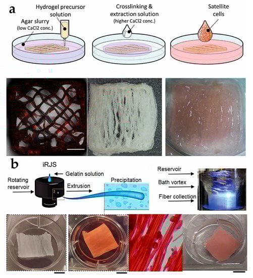 - Kang, D.; Louis, F.; Liu, H.; Shimoda, H.; Nishiyama, Y.; Nozawa, H.; Kakitani, M.; Takagi, D.; Kasa, D.; Nagamori, E.; et al. Engineered whole cut meat-like tissue by the assembly of cell fibers using tendon-gel integrated bioprinting. Nat. Commun. 2021, 12, 5059. [Google Scholar] [CrossRef] [PubMed]