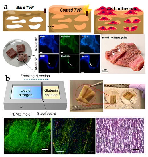 Proteins, such as soy protein, peanut protein, and gluten, have become crucial components in TVP [73,74]. Among these, the most commonly employed ones are soy flour, soy protein concentrate (SPC), and SPI, which have been discovered to be appropriate materials for promoting cellular adhesion [75]. The highly interconnected sponge-like porous scaffold consisting of soy protein and β-chitosan is used to cultivate mesenchymal stem cells in a 3D environment, indicating excellent biocompatibility and significant potentiality in bio-delivery systems [76]. Another similar study revealed that hybrid cultured meat containing animal cells and plant proteins obtained by covering the coating substrate on porous scaffolds realized myoblast growth and upgraded product texture and sensory characteristics [13] (Figure 3a). While this scaffold technology can support cell adhesion and proliferation, some porous scaffolds may not provide the necessary tissue alignment and sufficient sensory experience, which could pose a drawback for fully cut meat products, and further research is needed.