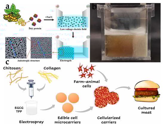 (a,b) Anisotropic scaffolds driven by electric field and plant protein [49] (reprinted from Cao et al. (2023) from Elsevier Ltd.). (c) The vector diagrams of cultured meat obtained through microcarriers [50] (reprinted from Zernov et al. (2022) with permission from Elsevier Ltd.).