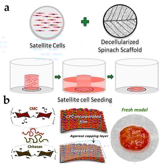 (a) Formation progress of BSC attachment on decellularized scaffold [53] (reprinted from Jones et al. (2021) with permission from Elsevier Ltd.). (b) Constitution of model meat cell sheets including material preparation, serum substitution, and product display [56] (reprinted from Park et al. (2021) with copyright from American Chemical Society).