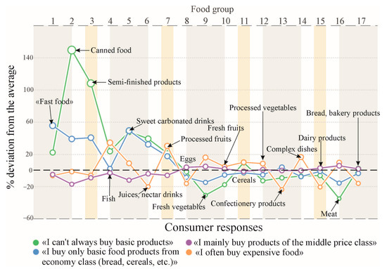 The average consumer who prefers “middle price products” consumes the first seven categories of goods (numbered 1–7, Table 1) at below average levels. These consumers do not differ from the average values, because they themselves set the main consumption trend in the general population of people surveyed.
