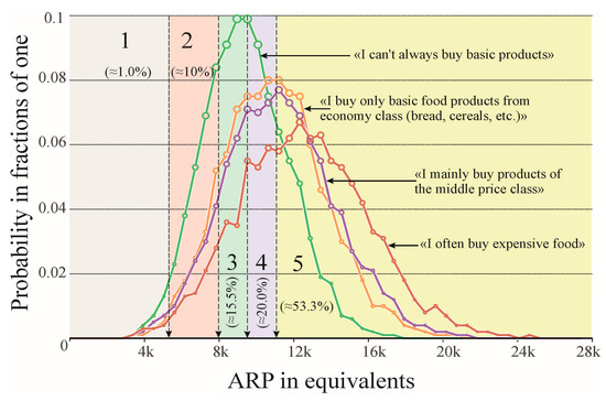 Thus, people from the group “who prefer buying cheap food” (canned and fast food) risk their diet falling almost twice as often into the area of pathogenic values (area 1 in Figure 4, less than 5310 equivalents). Upon further comparison, it is revealed that the total probability of falling into the propathogenic and unbalanced areas of dietary assessments of ARP for “poor” consumers is ≈3 times more likely than for those who purchase “expensive food products”. In general, an unsatisfactory situation can be recognized for ≈72% of consumers from this low-income group (estimates below 11,067 equivalents), which does not exceed half for other consumer groups and less than 1/3 (≈32%) for “rich” consumers.