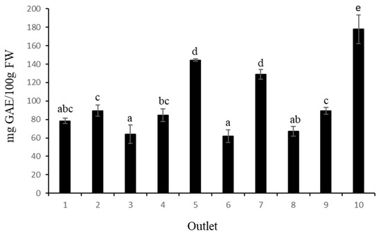 The total phenolic content (TPC) measured in the blueberries ranged from 61.94 to 177.94 mg GAE/100 g FW (Figure 1). Sample number 10 showed the highest TPC with 177.94 mg GAE/100 g FW, followed by samples 5 and 7 (without significant differences between them) and, finally, the fruit from samples 1, 3, 6, and 8 showed the lowest TPC values. According to [25], the mean TPC values for blueberries (cv. Bluecrop) at harvest were 274.48 mg GAE/100 g FW, while [26] reported TPC values around 252 mg GAE/100 g FW for the Duke and Bluecrop cultivars, reaching 161 mg GAE/100 g FW in Chandler blueberries. In general, our results showed that the TPC values obtained in this study were lower than those previously reported. It is known that a decrease in the total phenolic content can occur during postharvest storage [27].