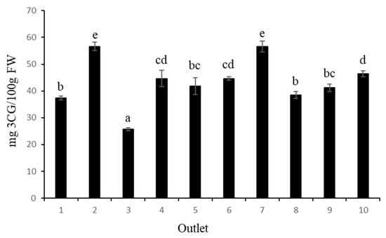 In terms of total anthocyanin content (TAC) (Figure 2), the highest values were obtained from samples 2 and 7, with 56.66 mg C3G/100 g FW and 56.54 mg C3G/100 g FW, respectively, while the fruit from sample 3 had the lowest value (25.68 mg C3G/100 g FW). In a recent review, Ref. [28] summarised the results of TAC from different blueberry cultivars and different locations, indicating a high variation among blueberry cultivars for total anthocyanin content, although the method of determination was different. The values ranged from 19.3 to 677.8 mg C3G per 100 g FW. In this sense, genotypes and environmental growing conditions could be the main reasons for the differences in total anthocyanin content between cultivars.