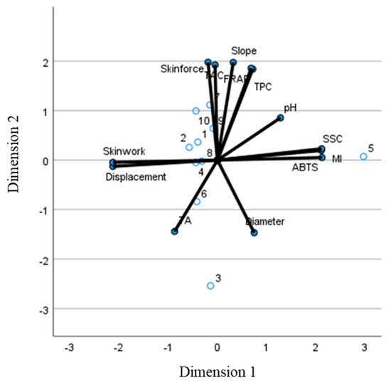 Finally, a CATPCA analysis was performed with the aim of reducing the original set of variables to a smaller set of uncorrelated components that represent most of the information found in the original variables to differentiate the samples. In the CATPCA including all the variables (quality and texture), the first dimension (44.27% of the variability) was positively related mainly to SSC, ABTS, MI, and the mechanical properties displacement at skin break and skin break work. The second dimension (39.02% of the variability) was positively related to the rest of the variables analysed. With respect to dimension 1, all the samples were closely grouped in the middle (Figure 4), with sample 5 being the only outlier. This sample had the highest MI, SCC, and ABTS values and the lowest values for both mechanical properties affecting this dimension. For dimension 2, most of the samples are clustered around −1/+1, with the exception of sample 3, which is below −2 and samples 7 and 10 which are above +1.