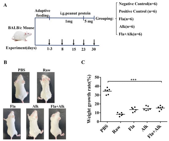 Sensitization flow chart of BALB/c mice (A) and effects of Fla and Alk-treated peanut on morphology (B) and weight growth rate of mice (C). (***) p-value < 0.001.