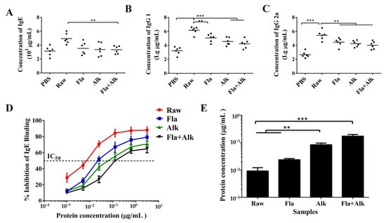 Influence of peanut treated with Fla and Alk on antibody secretion and antibody binding force. (A): concentration of IgE in serum, (B): concentration of IgG1 in serum, (C): concentration of IgG1 in serum, (D): IgE binding ability of peanut protein, (E): IC50 value of peanut protein binding to IgE. (**) p-value < 0.05, (***) p-value < 0.001.