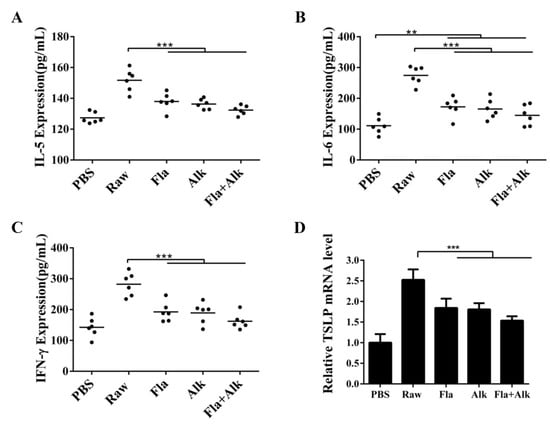 Effects of peanut treated with Fla and Alk on secretion of IL-5 (A), IL-6 (B), IFN-γ (C) and expression of TSLP gene (D). (**) p-value < 0.05, (***) p-value < 0.001.