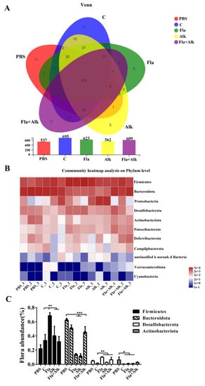 The diversity of the intestinal flora in mice was analyzed, and the results are shown in the following figure. As shown in Figure 6A, the flora classes of the mice in the different treatment groups differed greatly, with 378 species common to the mice in the five treatment groups and 11, 17, 9, 5, and 17 species unique to the control, peanut grown, Fla, Alk, and Fla + Alk-treated mice, respectively. The mouse flora class was counted to obtain a plot of colony diversity. It is known from the figure that the diversity of the flora of mice increased in the peanut-sensitized group compared to the control group, and this phenomenon was reduced after the enzyme treatment. This result illustrated that raw peanut gavage caused gastrointestinal disorder in mice and they developed allergic phenomenon, while the allergenicity of peanut was effectively reduced after the enzyme treatment. The mice intestinal colony composition was further quantitatively analyzed, and the results are listed in Figure 6B. The results showed that the content of flora differed greatly between the mice in different treatment groups. A quantitative analysis of the mouse intestinal flora is presented in Figure 6C. It can be seen that the number of Bacteroidetes, Firmicutes, Desulfovibrio, and actinobacteria decreased in the enzyme-treated group compared to the peanut-sensitized group.