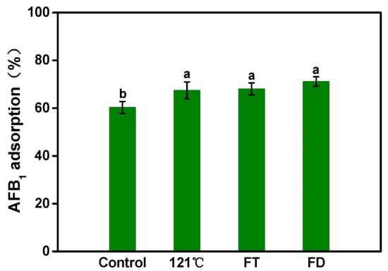 The effect of mycelia pretreatments on AFB1 adsorption. The abbreviations FT and FD correspond to repeated freeze–thaw and vacuum freeze-drying treatments, respectively, while the control group represents wet mycelia without any treatment. The values are presented as means ± standard deviation (SD); a and b indicate significant differences between different components or treatments (p < 0.05).