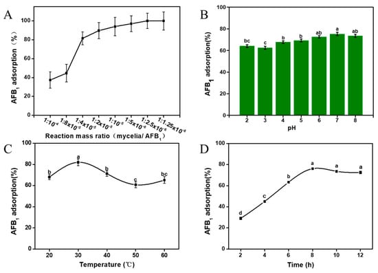 AFB1 adsorption capacity of A. auricular mycelia: effect of reaction mass ratio (mycelia/AFB1) (A), effect of incubation pH (B), effect of incubation temperature (C), and effect of incubation time (D). Values are expressed as means ± SD; a, b, c and d indicate significant differences between different treatments (p < 0.05).
