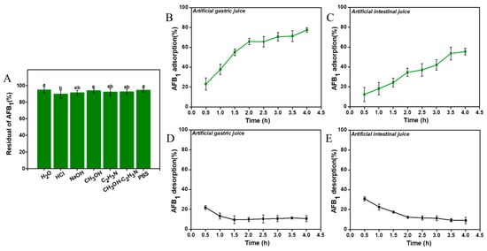 AFB1 adsorption stability of A. auricular mycelia: the residual AFB1 content after washing with different eluents (A), AFB1 adsorption and its desorption rate in artificial gastric juice (B,D), and AFB1 adsorption and its desorption rate in artificial intestinal juice (C,E). Values are expressed as means ± SD; a, b, and ab indicate significant differences between different treatments (p < 0.05).