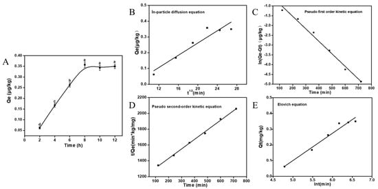 Kinetics of adsorption: the kinetics curve of AFB1 adsorbed by A. auricula mycelia (A–E) represent the kinetics model fitting curve of AFB1 adsorbed by A. auricula mycelia, using four kinetic models including the intra-particle diffusion model, pseudo-first-order kinetic model, pseudo-second-order kinetic model, and Elovich model. Values are expressed as means ± SD; a, b, c, and d indicate significant differences between different treatments (p < 0.05).