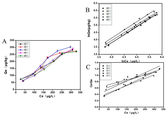 The adsorption isotherm of Qe (adsorption amount of mycelia) with Ce (equilibrium concentration of AFB1) is shown in Figure 5A. The equilibrium adsorption amount of mycelia demonstrates a significant increase with the rise in the initial concentration of AFB1. At the same time, the adsorption of AFB1 by mycelia showed a decreasing trend as the temperature increased from 25 °C to 45 °C, with the highest adsorption observed at 35 °C. Furthermore, we used the Freundlich equation and the Langmuir equation to fit data of adsorption isotherm.