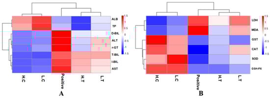 Heat map of liver functions, lipid peroxidation and antioxidant levels. Positive (P) represents the positive control group, rats infected with AFB1; LC and HC represent low-dose Auricularia auricula mycelia-fed and high-dose mycelia-fed normal SD rats, respectively; LT and HT represent the rats treated with mixed toxins and different doses of mycelia powder. (A) liver function related index; (B) lipid peroxidation and antioxidant levels.
