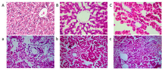 The liver histopathological slices observation of rats; (a–c) represent the positive group, the low dose experimental group, and the high dose experimental group, respectively, and (A–C) are their corresponding control groups.