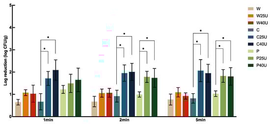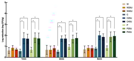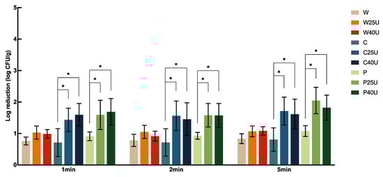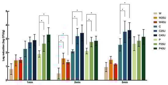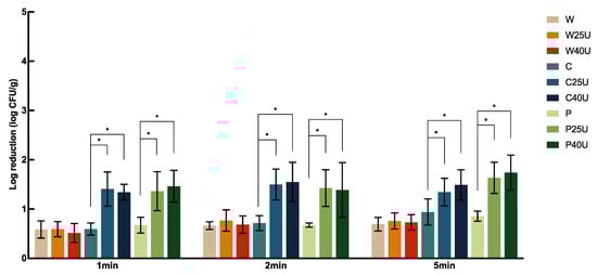 L. monocytogenes, and W25/40U only increased the reduction by less than 0.39 log CFU/g, with no significant difference. On the contrary, C or P combined with ultrasound for 1, 2, or 5 min all significantly increased the reduction of