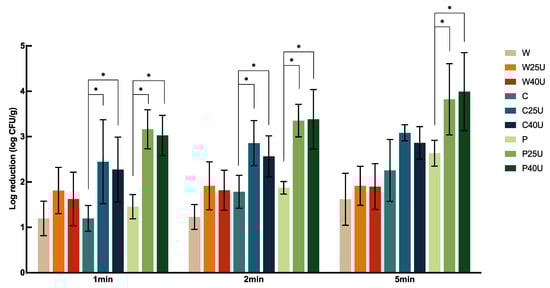 Two technical replicates were included for each treatment in each trial, and four trials (biological replicates) were performed on separate days (n = 8). Student’s t-test was used to compare population reductions between two pathogens on the same matrix under the same treatment condition (W, W25U, W40U, C, C25U, C40U, P, P25U, or P40U) and time (1, 2, or 5 min). One-way ANOVA with Tukey’s Post-hoc test was used to compare the populations of a single pathogen between (1) different treatment conditions at the same treatment time on the same matrix, (2) different treatment times for the same treatment condition on the same matrix, and (3) different matrices which were treated the same (treatment condition and time). A p value less than 0.05 was considered to be significant.