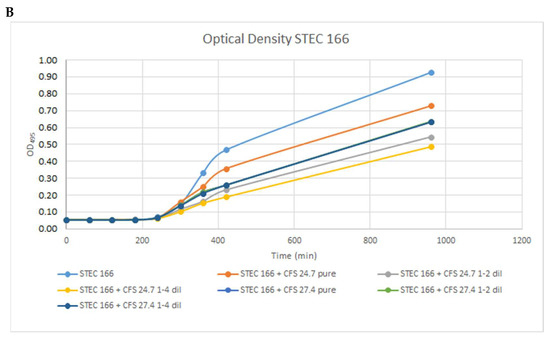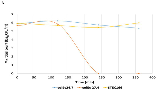 Results of the inhibitory activity of the colicins produced ColEc 24.7 and 27.4 strains against STEC 166 are shown in Figure 2. These results showed a difference in the antimicrobial activity of the CFS analyzed. The CFS of ColEc 27.4 showed potential bactericidal activity against pathogenic strains (Figure 2A) when determining the OD, observed by the absence of growth in the early stages and the absence of viable cells when plate assays were performed. These results are indicative of a bactericidal effect. On the other hand, we documented a very slight decrease in the viability of pathogenic strains exposed to SFC of ColEc 24.7, although this effect was not maintained over time. The optical density and viable cells were lower and proportional to the dilution of CFS used (Figure 2B). These results show an antibacterial activity of ColEc 27.4 CFS on STEC strains.