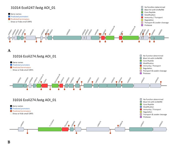 In this work, colicins and microcins have been detected with bacteriocin gene mining that was absent in PCR or genome annotation. These differences may be due to the quality of the assemblies obtained by the sequencing procedure. Genome annotation and mining tools are not without limitations due to the tedious and automated nature of these methods and the curation of genome databases compared to the mining tools. Several authors have approached this issue, such as Poptsova and Gogarten [56] and Kasaa [57].